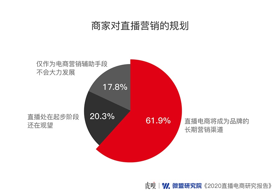 全平台都在布局的背景下,商家也倾向布局多个直播渠道来增加引流曝光机会。虎嗅联合微盟研究院调查表明,从在抖音、快手等直播平台,到淘宝、京东等电商平台之外,再到小程序直播这样的“后起之秀”,都成为商家直播布局的主要渠道。关于对直播的运营规划,超六成商家表示要将直播作为常态化营销方式,每年投入固定资源进行发展。