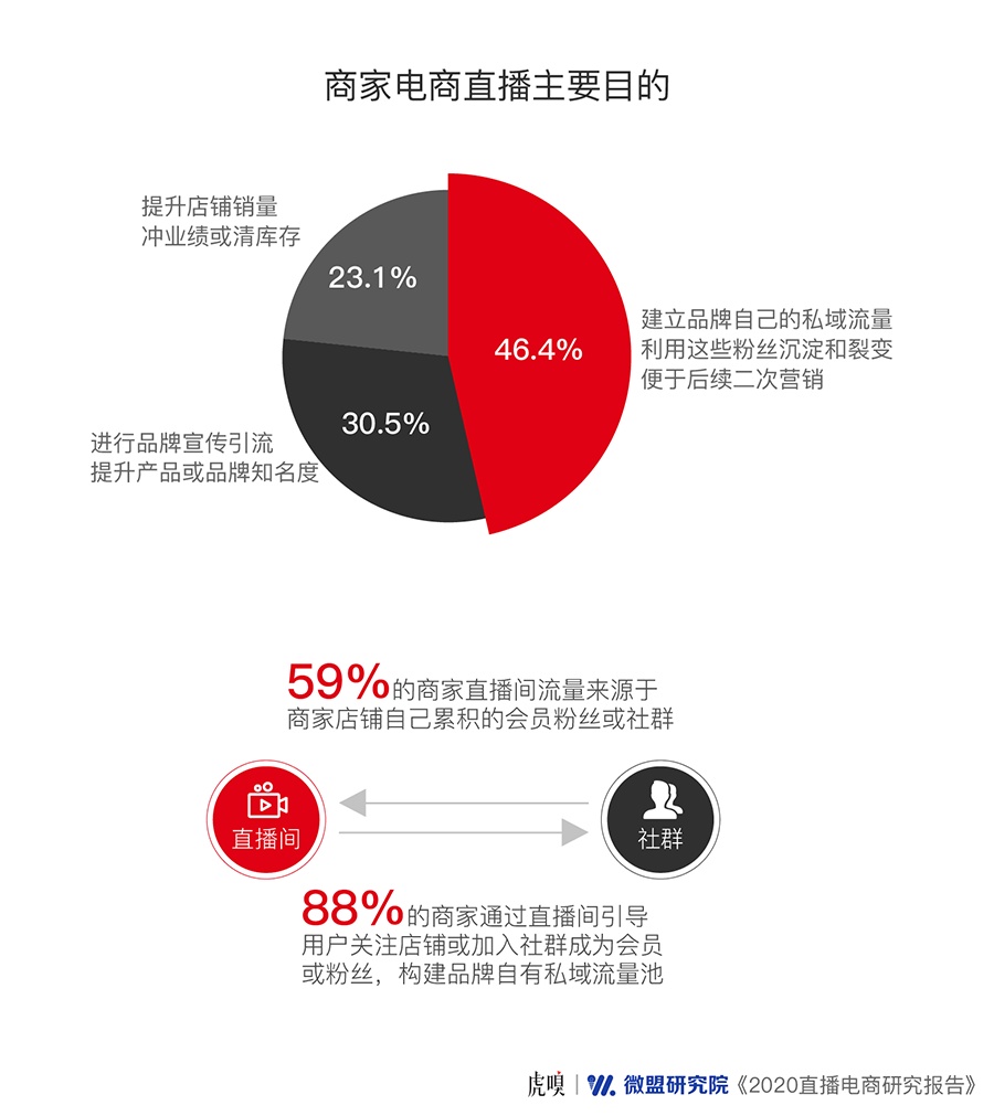 这一过程中,私域流量的价值正在被商家所重视,虎嗅联合微盟研究院调查问卷表明,已经有46%的商家意识到做直播的目的是为了建立品牌私域流量,59.1%的商家直播间流量的主要来源之一就是商家自己累积的会员粉丝以及社群,即“私域流量”。在直播运营中,有88%的商家已经有意识地引导用户关注店铺或加入社群,通过此种方式构建私域流量,进行后续的二次营销和推广,来达到流量变现目的。也有商家选择建立自己的私域直播间,培养自己的主播和商家自播体系。