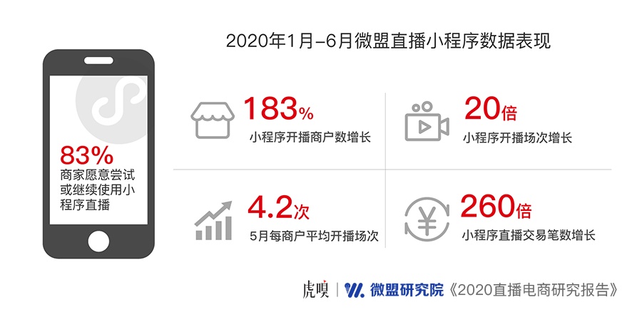 小程序私域直播的优势吸引了商家的涌入,官方数据显示,自公测以来目前已有近10万商家开通了小程序直播。虎嗅联合微盟研究院调查问卷显示,有83%的商家愿意尝试或继续使用小程序直播。微盟自有数据表明,2020年上半年微盟直播小程序平台开播商户数增长迅猛,截至2020年6月,小程序开播商户数较1月增长183%,商家月均直播高达4.2次,开播场次增长超20倍,同时小程序直播交易笔数增长260倍,展现出出色的带货能力。