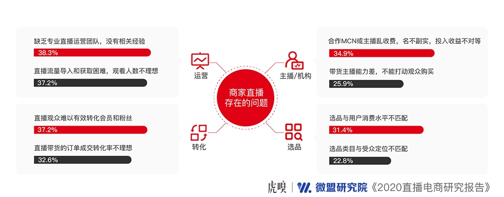 根据虎嗅联合微盟研究院调查,商家直播运营的过程中存在诸多问题和难点,主要包括运营、主播和机构、转化以及选品几个方面的问题:自身组织和运营能力方面,缺少相关专业的人才和运营团队支撑,缺乏经验;粉丝转化和订单转化不理想;选品与粉丝受众定位以及消费水平不匹配;在与MCN机构、网红主播的合作中,由于缺乏相关监管和规范,行业鱼龙混杂,商家投入与收益不对等。因此商家做电商直播,亟需提升组织能力和精细化运营能力,同时,直播带货也需要相关的行业监管,实现规范化发展。