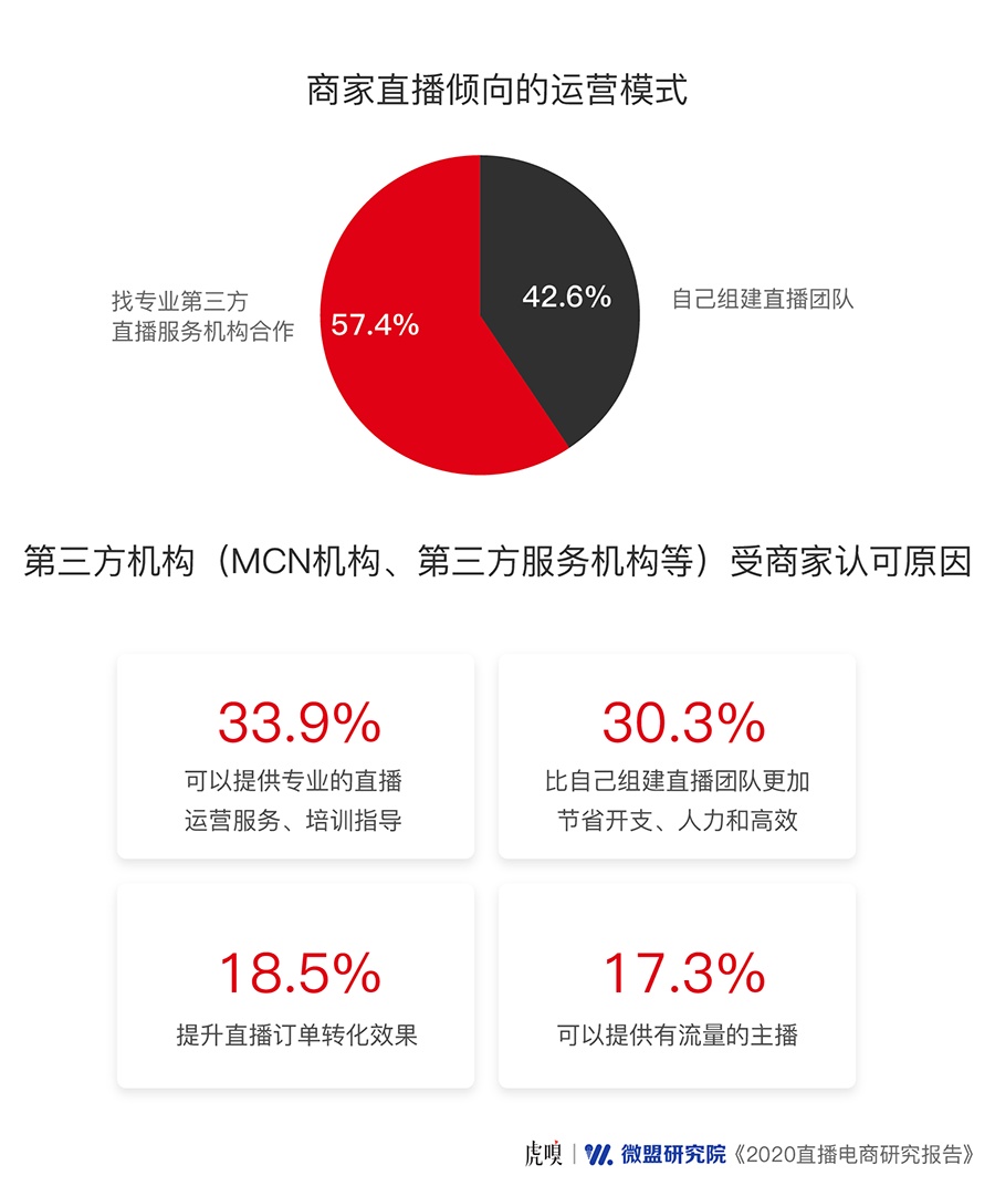 在此背景下,商家想靠自行组建直播团队或孵化自己的主播难度比较大,商家更倾向于将专业的事交给专业的第三方服务商。根据虎嗅联合微盟研究院调查,57.4%的商户选择找第三方直播服务机构来合作,主要看中其能够提供专业的运营服务、有流量的主播以及节省开支、人力,提升转化等等。而对于第三方机构来说,随着市场对主播以及运营方要求也越来越高,完善服务能力,培育更多有带货能力的主播,是未来的核心竞争力。