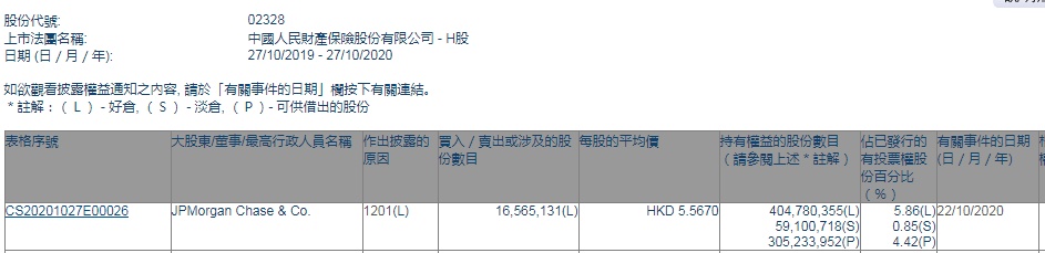 智通财经APP获悉,香港联交所最新资料显示,10月22日,摩根大通减持中国财险(02328)1656.5131万股,每股作价5.567港元,总金额约为9221.81万港元。减持后最新持股数目约为4.05亿股,最新持股比例为5.86%。