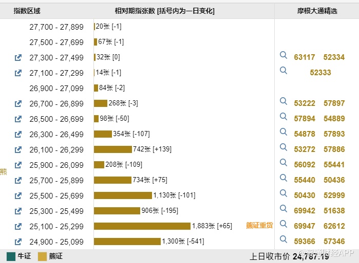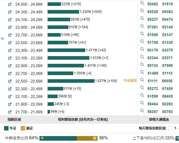 智通财经APP获悉,截至10月27日,恒指最新的牛熊街货比例64:36。摩根恒指牛熊证街货分布图中的数据显示,熊证街货重货区在25100-25299区间,该区间最新熊证数量为1883张,较上一交易日增加65张;最多新增在26100-26299区间,该区间最新熊证数量为742张,较上一交易日增加139张。牛证街货重货区在22500-22699区间,该区间最新牛证数量为1827张,较上一交易日增加100张;最多新增在24300-24499区间,该区间最新牛证数量为1230张,较上一交易日增加500张。