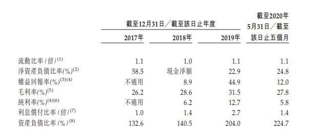 主要财务比率方面,截至2020年5月31日止前5个月,三巽控股的流动比率为1.1倍,净债务与权益比率为24.8%,权益回报率为12.0%,净利率5.8%,利息偿付比率1.4倍,资产负债比率由2019年末的204.0%增至224.7%。