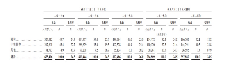 期内,园林业务为该公司的主要收益来源之一。于2017财年、2018财年、2019财年以及2020财年前6个月,来自园林分部的收益分别占公司总收益的约49.7%、57.4%、49%以及52.1%; 公司自2016年起加大力度发展生态修复分部,于相同期间,该分部分别贡献公司总收益的约45.4%、35.4%、44.9%以及40.5%。