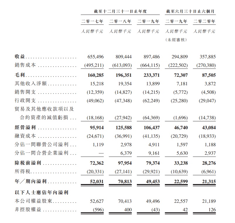 公司于2017财年、2018财年、2019财年以及2020年前6个月分别录得收益约人民币6.56亿元、人民币8.09亿元、人民币8.98亿元以及人民币3.57亿元。