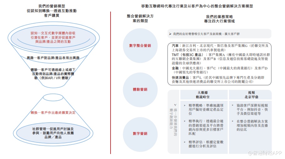 时空视点是一家以数字化为中心的整合营销解决方案供应商,深植于消费品市场,致力于通过数字技术实现营销效果。该公司拥有约20年的历史,专注于为汽车、TMT(包括3C产品)、金融和快速消费品行业的知名品牌提供整合营销解决方案。其整合营销解决方案可分为三类:(i)数字整合营销;(ii)数字营销;及(iii)体验营销。