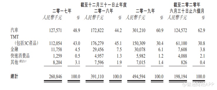 该公司的客户包括20家财富世界500强公司(或其附属公司)及汽车、TMT(包括3C 产品)、金融及快速消费品行业的其他领先公司。下表载列时空视点于往绩记录期按客户行业划分的收入明细: