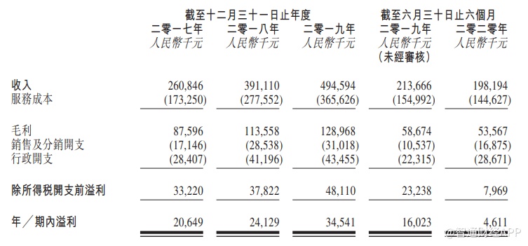 2017-2019年度,时空视点年收入分别为2.6亿元(单位:人民币,下同)、3.91亿和4.95亿元。同期服务成本分别为1.73亿、2.78亿和3.66亿。期内净利润分别为2064.9万、2412.9万和3454.1万。