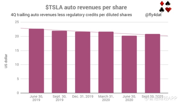 如果计算每股汽车收入,情况就更糟了。多年来股票发行的稀释性使得收入分散到更多的股票上。事实上,使用相同的季度滚动收入方法,我们看到在没有信贷销售的情况下,每股收入在下降: