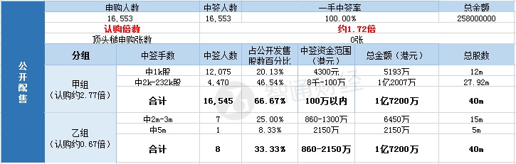 其中,公开配售申购人数16553人,一手中签率100%,认购倍数约1.72倍。