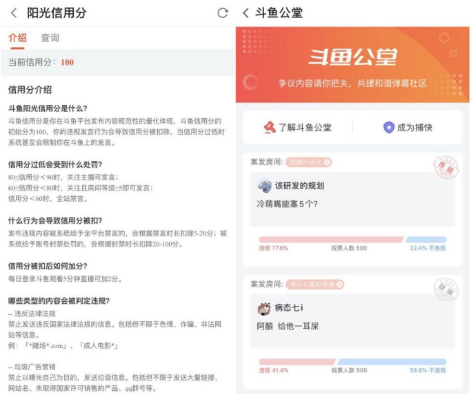 与此同时,除了“阳光信用分”斗鱼还别出心裁的上线了“斗鱼公堂”功能,邀请斗鱼水友共同加入直播间弹幕内容治理。满足条件的资深水友将获得“斗鱼捕快”专属身份,有资格根据《斗鱼弹幕礼仪规范》并结合自己对弹幕内容的感受,判断发布者是否违规,一旦弹幕被“斗鱼捕快”们判定违规,平台将会对弹幕发布者实施禁言等处罚,并且扣除相应的“阳光信用分”。
