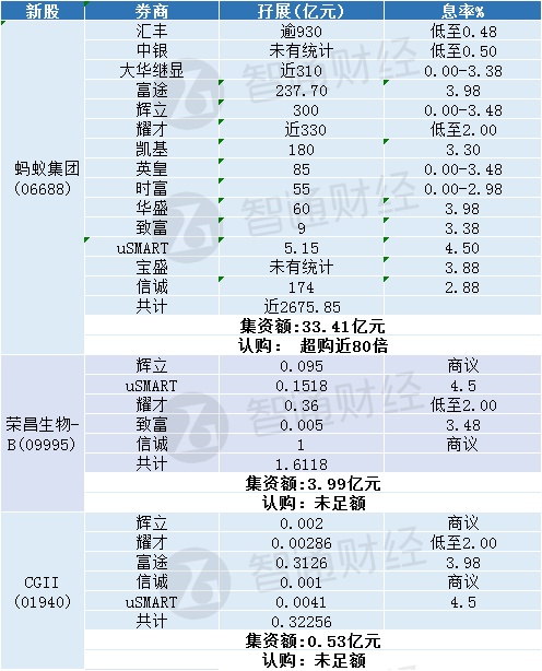 智通财经APP获悉,蚂蚁集团(06688)、荣昌生物-B(09995)、CGII (01940)正在招股中。截至10月28日,辉立 、耀才、信诚等券商合计分别为其借出约2675.85亿港元、1.6118亿港元、0.32256亿港元 。其中,蚂蚁集团超购近80倍,其他均未足额。