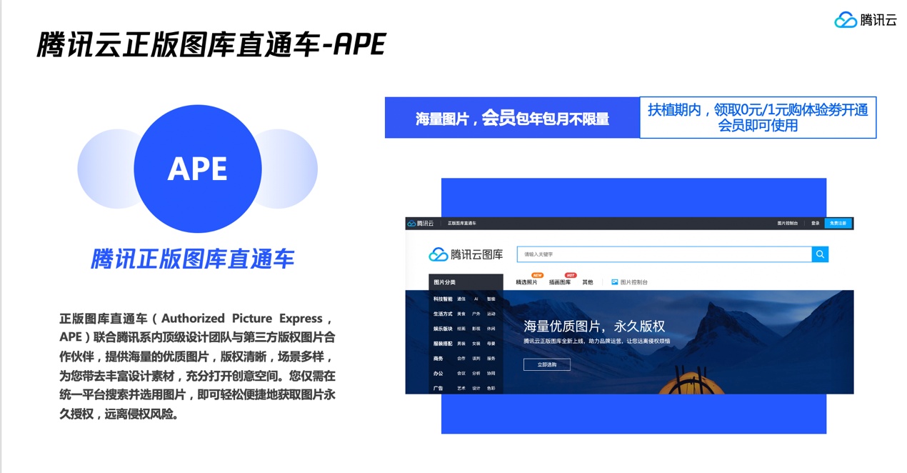 腾讯云泛互联网行业文创产品总监王奕介绍,正版图库直通车整合了腾讯用户研究与体验设计部(CDC)素材资源,联合易维视、全景视觉等供应商提供图片, “产品上线初期,我们也推出了针对自媒体内容创作者和小程序开发者的扶持计划,扶植期内,用户可以0元或低价体验包年包月会员。”