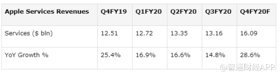 因此,该机构表示,由于Apple Music和Apple TV+等服务的增长,预计将带动该公司Q4营收将增长28%至1609亿美元。