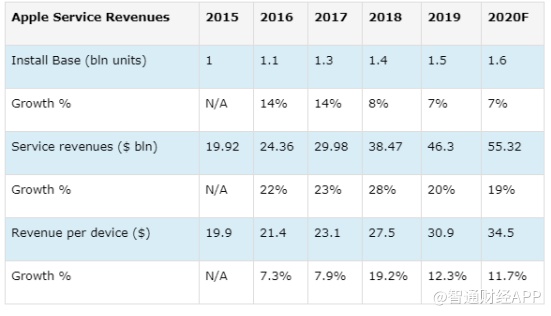 而对于服务业务方面,苹果的营收目前已经开始逐渐转向其服务组合,虽然该公司的产品销售仍占据了其大部分的营收来源,但该公司已经意识到了通过销售服务来开发其庞大的用户基础的机会。可以看到,该公司在过去5年里,每台设备的服务营收平均增长了11.7%。基于该公司在市场拥有1.6亿台设备的情况下,该机构预计苹果2020年的服务营收将达553.2亿美元,年增长率为19%。