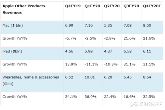 另一方面,以AirPods和Apple Watch产品为主推产品的可穿戴设备业务在上季度增长放缓至17%,这主要归因于实体店的关闭。不过,目前该公司已逐渐在全球重新开启部分门店,因此,该机构预计该业务增长率将达32%。