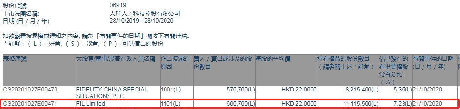 智通财经APP获悉,香港联交所最新资料显示,10月21日,FIL Limited增持人瑞人才(06919)60.07万股,每股作价22港元,总金额约为1321.54万港元。增持后最新持股数目约为1111.55万股,最新持股比例为7.23%。