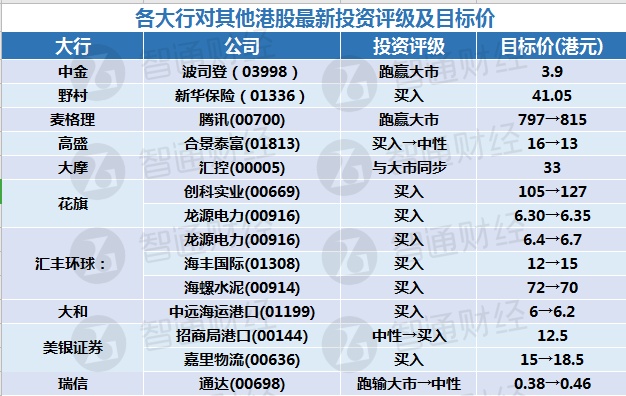 三、各大行对其他港股最新投资评级及目标价