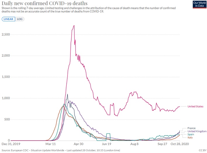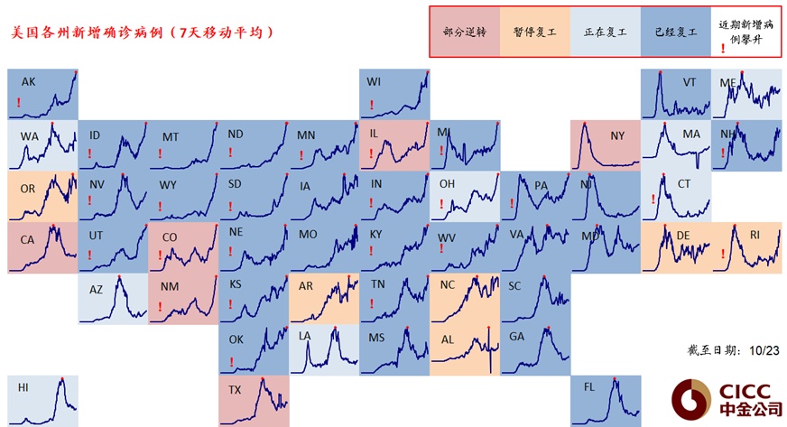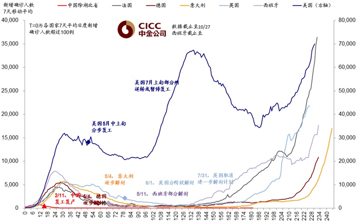 i. 近期海外市场(特别是欧洲)再度大幅波动,主要还是与担心公共卫生事件的持续升级有关。目前,欧洲第二波和美国第三波的公共卫生事件仍在持续攀升,美国第三波公共卫生事件的每日新增确诊病例已经超过第二波的高点,上周五一度高达8.5万例;欧洲也在继续攀升,特别是法国尤为显著。