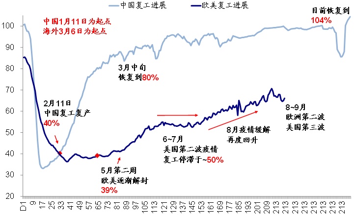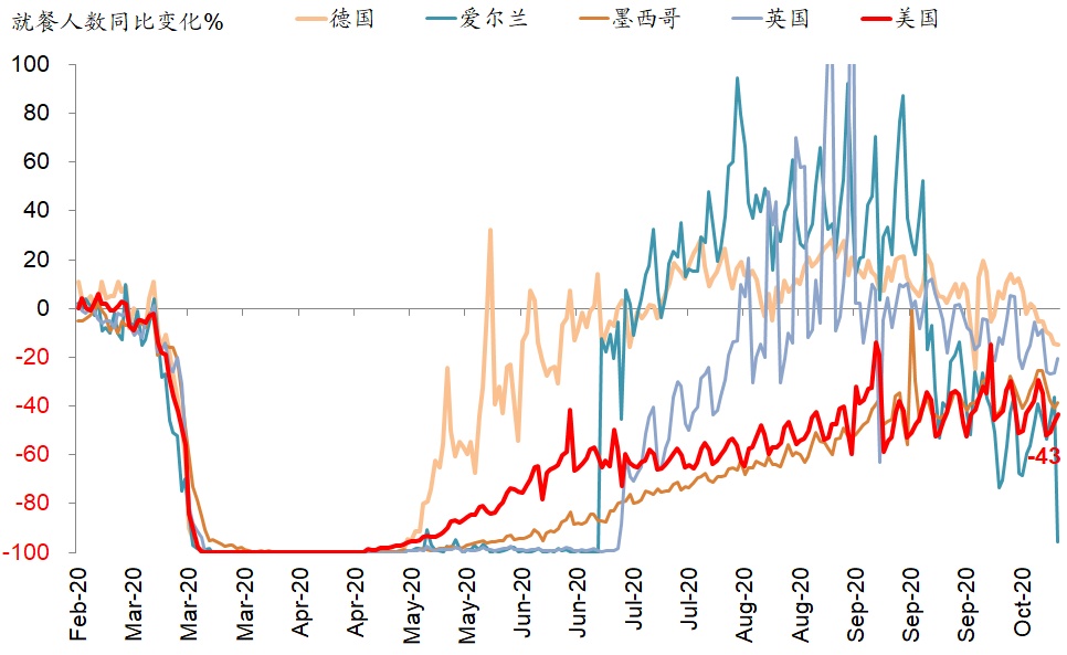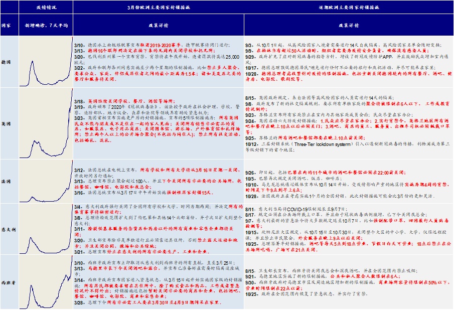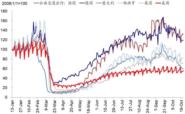 iii. 公共卫生事件升级的直接后果是,将再度阶段性放慢复工节奏拖累部分需求。为了应对公共卫生事件的不断升级和扩散,欧洲主要国家都重新采取了一定的封闭措施,这一点从近期如出行和就餐等高频指标都能够得到体现,因此的确会对复工和需求产生一定拖累。