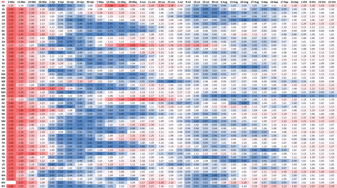 相比之下,目前美国第三波公共卫生事件相对严重的中西部各州依然都处于完全的复工状态、尚未采取太多措施,且R0普遍高于1,因此预计当前公共卫生事件的升级仍将延续一段时间。