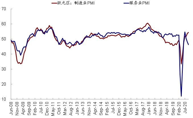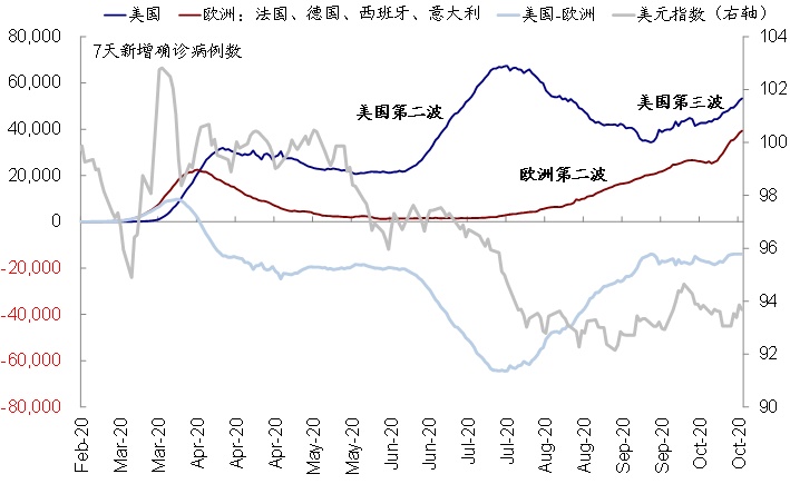 这一分化,可能会阶段性的对欧洲资产(如股市和欧元汇率)产生拖累。以美元指数为例,其从7月以来的走势,基本就与欧美之前的公共卫生事件差高度重合。这正是基于这一考虑,我们在海外资产配置10月报《大选冲刺期的配置策略》中判断,欧洲公共卫生的升级可能给复工进程和短期市场情绪造成压力,并被动推升美元指数,因此维持对于欧洲谨慎乐观的看法。