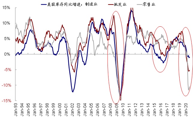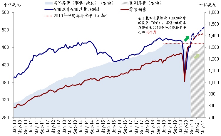 如我们在专题报告《海外资产配置之库存周期:如果新一轮补库周期开启》中测算,如果假设:1)当前第三波公共卫生事件对复工造成1个月的逆转再回升(当前~66%);2)消费逐步降速,一季度后降至~0.2%的环比长期增速,那么当前零售商和批发商库存回升至2019年平均值从目前还需要大概8个月左右,至2021年中。相对乐观和悲观的公共卫生事件与复工假设分别对应4个月和14个月,不考虑进口影响。