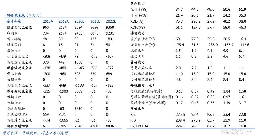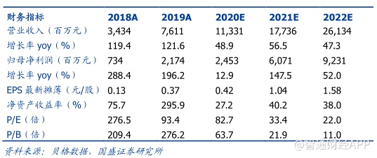 投资策略:策略:我们预计公司2020-2022年净利润为24.53亿元/60.71亿元/92.31亿元,2020年调整后净利润为36.84亿元。我们预测公司2020-2022年EPS为0.42元/1.04元/1.58元,对应PE为82.7x/33.4x/22.0x,调整后2020年EPS为0.63元,对应PE为55.3x,维持“买入”评级。