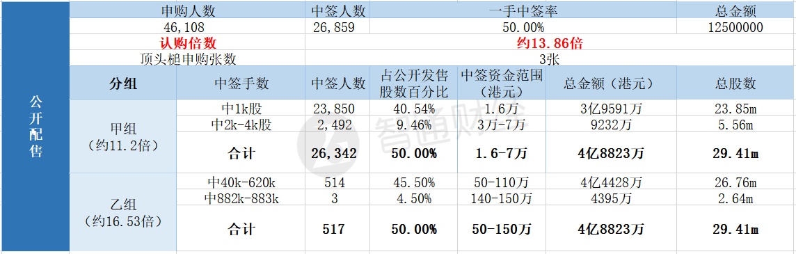 其中,公开配售申购人数46108人,一手中签率50%,认购倍数约13.86倍。