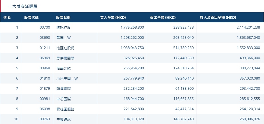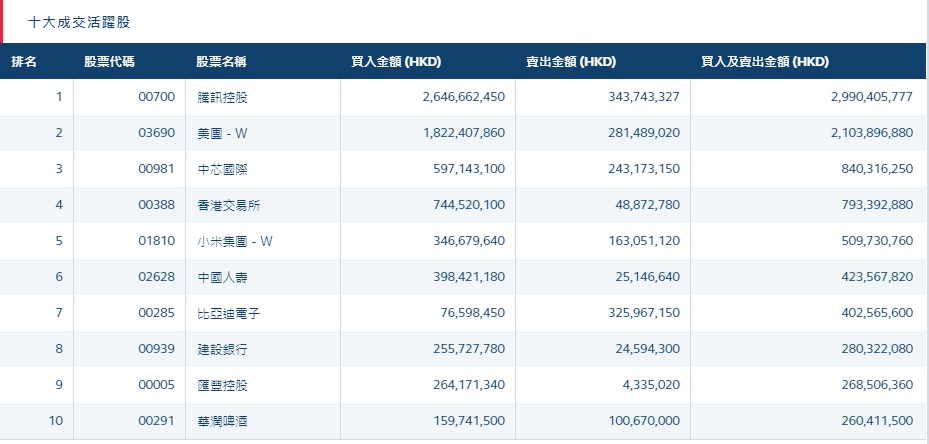此外,中芯国际(00981)、建设银行(00939)、碧桂园服务(06098)分别获净买入4.06亿、2.31亿、1.79亿港元。