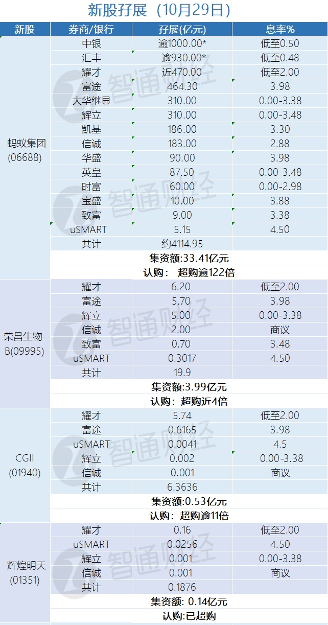 智通财经APP获悉,蚂蚁集团(06688)、荣昌生物-B(09995)、CGII (01940)、辉煌明天(01351)正在招股中。截至10月29日,辉立 、耀才、信诚等券商/银行合计分别为其借出约4114.95亿港元、19.90亿港元、6.3636亿港元、0.1876亿港元 。其中,蚂蚁集团超购逾122倍,荣昌生物-B超购近4倍,CGII 超购逾11倍。