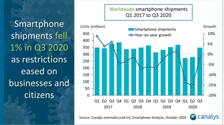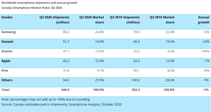 智通财经APP获悉,10月30日,国际市场研究机构Canalys发布全球手机市场Q3季度跟踪报告,数据显示,2020年Q3,全球智能手机出货量同比下降1%,但环比增长22%。头部厂商中变化最大的是,小米出货量位居全球第三。这是继2014年之后,小米第二次进入全球前三,同比增长45%,是前四名中唯一逆势大涨的手机厂商。