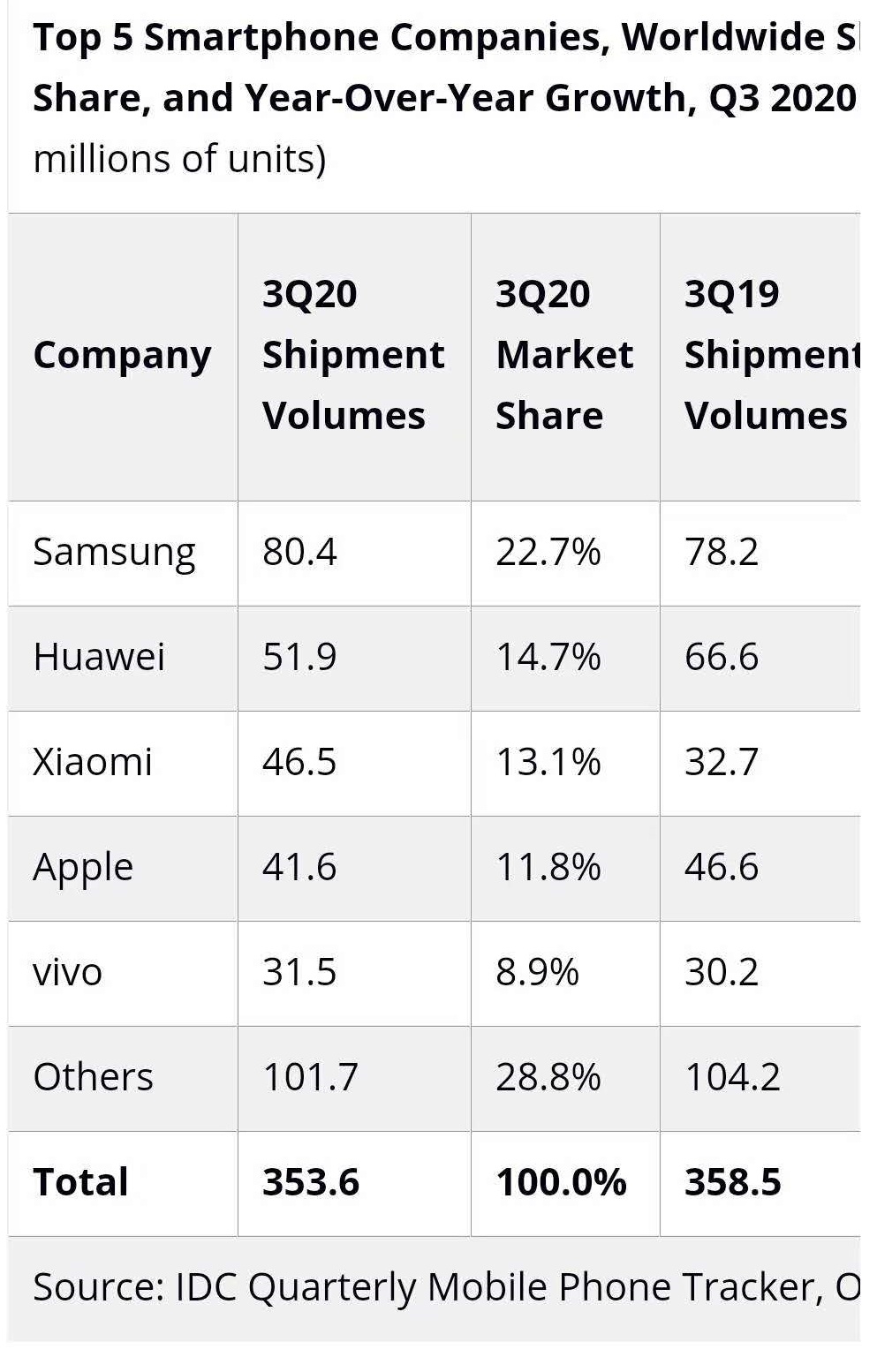 智通财经APP获悉,国际市场研究机构Canalys今日发布全球手机市场Q3季度跟踪报告,数据显示,2020年Q3,全球智能手机出货量同比下降1%,但环比增长22%。头部厂商中变化最大的是,小米集团-W(01810)出货量位居全球第三。这是继2014年之后,小米第二次进入全球前三,同比增长45%,是前四名中唯一逆势大涨的手机厂商。截至9时45分,涨5.05%,报价22.9港元,成交额10.38亿。