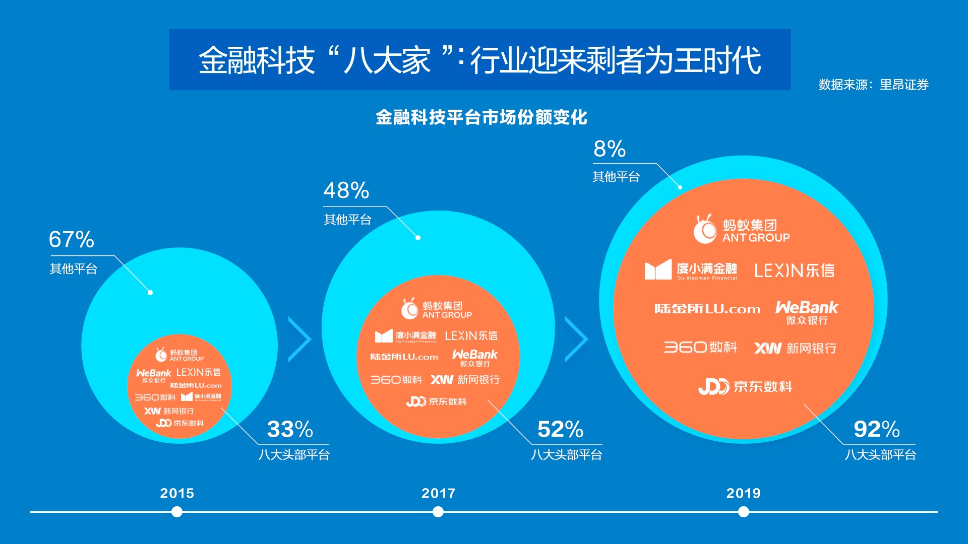 近期,中信里昂给出一份报告称,2019年八大平台占据了互联网贷款超过92%的市场份额,它们分别为:蚂蚁、陆金所、微众银行、新网银行、度小满、360金融、京东数科、乐信。