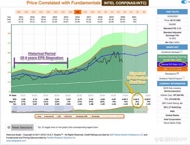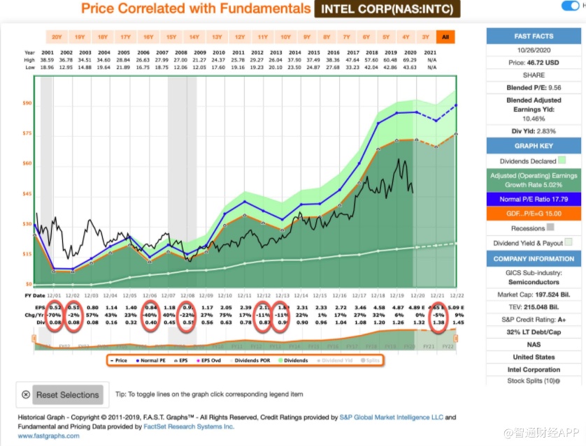 从下面的图表中可以看出,在过去的20年里,英特尔的每股收益每隔几年就会连续两年出现负增长。在互联网泡沫破灭期间,英特尔的收益在2001/2年下跌了超过70%。