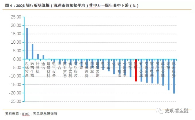 20Q3银行板块涨幅居行业中下游。20Q3申万银行指数季度下跌13.05%,排在申万一级行业中下游。Q3几乎所有行业均发生了不同程度的调整,行业涨幅前三位为农林牧渔、医药生物、计算机,均为7月底-8月初涨幅较大的板块。