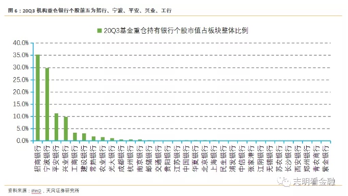 20Q3机构重仓银行个股占比前五家依次为招商银行(03968)、宁波银行、平安银行、兴业银行、工商银行(01398)(20Q2为招商银行、宁波银行、兴业银行、工商银行和常熟银行),变化较大。