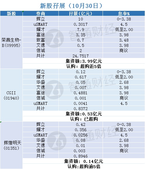 智通财经APP获悉,荣昌生物-B(09995)、CGII (01940)、辉煌明天(01351)正在招股中。截至10月30日,辉立 、耀才、信诚等合计分别为其借出约24.7517亿港元、0.8372亿港元、0.8946亿港元 。其中,荣昌生物超购近5倍,CGII已超购,辉煌明天超购逾5倍。