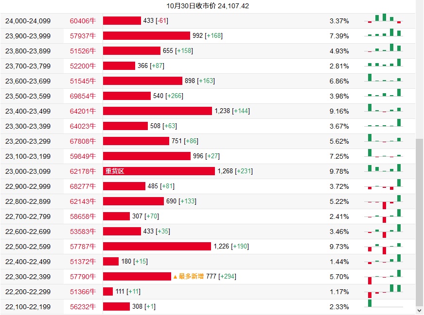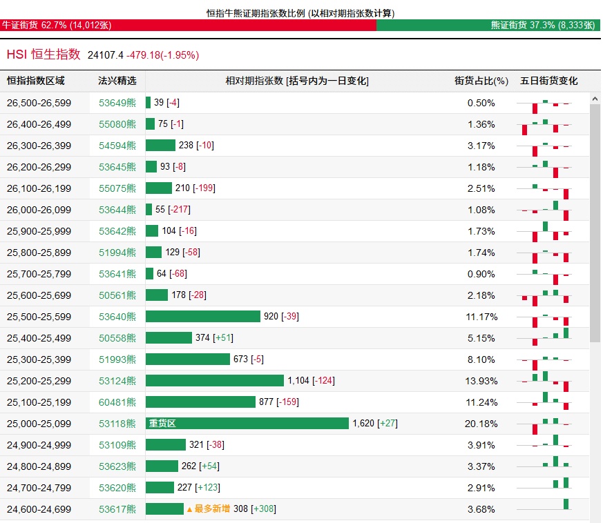 智通财经APP获悉,截至10月30日,恒指最新的牛熊街货比例63:37。法兴银行恒指牛熊证街货分布图中的数据显示,熊证街货重货区在25000-25099区间,该区间最新熊证数量为1620张,较上一交易日增加27张;最多新增在24600-24699区间,该区间最新熊证数量为308张,较上一交易日增加308张。牛证街货重货区在23000-23099区间,该区间最新牛证数量为1268张,较上一交易日增加231张;最多新增在22300-22399区间,该区间最新牛证数量为777张,较上一交易日增加294张。