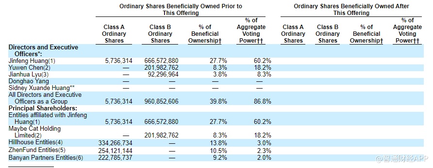 IPO前,该公司创始人、董事会主席兼首席执行官黄锦峰持股占比27.7%,投票权占比60.2%;联合创始人、董事兼首席运营官陈宇文持股占比8.3%,投票权占比18.2%;联合创始人、董事兼首席营销官吕建华持股占比3.8%,投票权占比8.3%;高瓴资本持股占比13.8%,投票权占比3.0%。