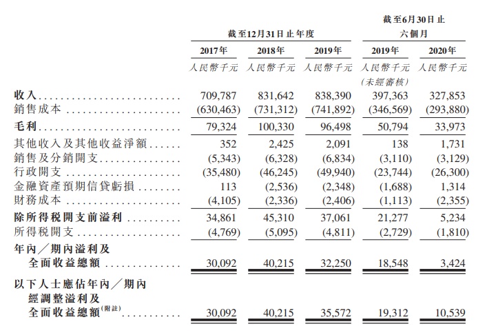 截至2019年12月31日止三个年度及截至2020年6月30日止六个月,该公司收入分别约为7.098亿元(人民币,下同)、8.316亿元、8.384亿元及3.279亿元,其中超过85%的总收入来自以上四种主要产品的销售,而来自冷裱膜的收入在所有产品中一般最高。