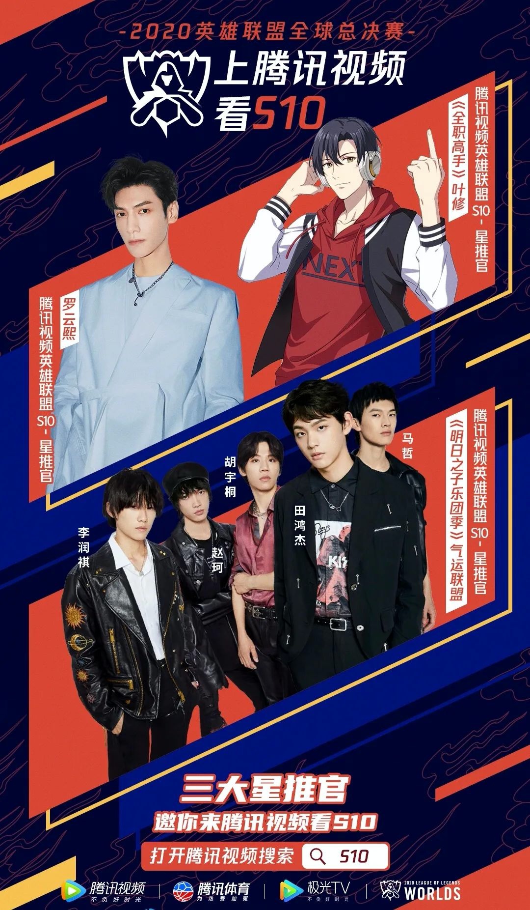 当本命与电竞爱豆同框,电竞女孩们收获的又何止是双倍快乐。为使节目兼具娱乐性与观赏性,此次受邀担任“腾讯视频英雄联盟S10星推官”包括新鲜出炉的明日之子乐团季冠军队伍——气运联盟(胡宇桐 、田鸿杰、李润祺、马哲、赵珂),收割万千少女芳心的二次元电竞男神——《全职高手》叶修,以及三次元帅气“电竞中年人”,让所有电竞文男主从此“有了脸”的罗云熙。