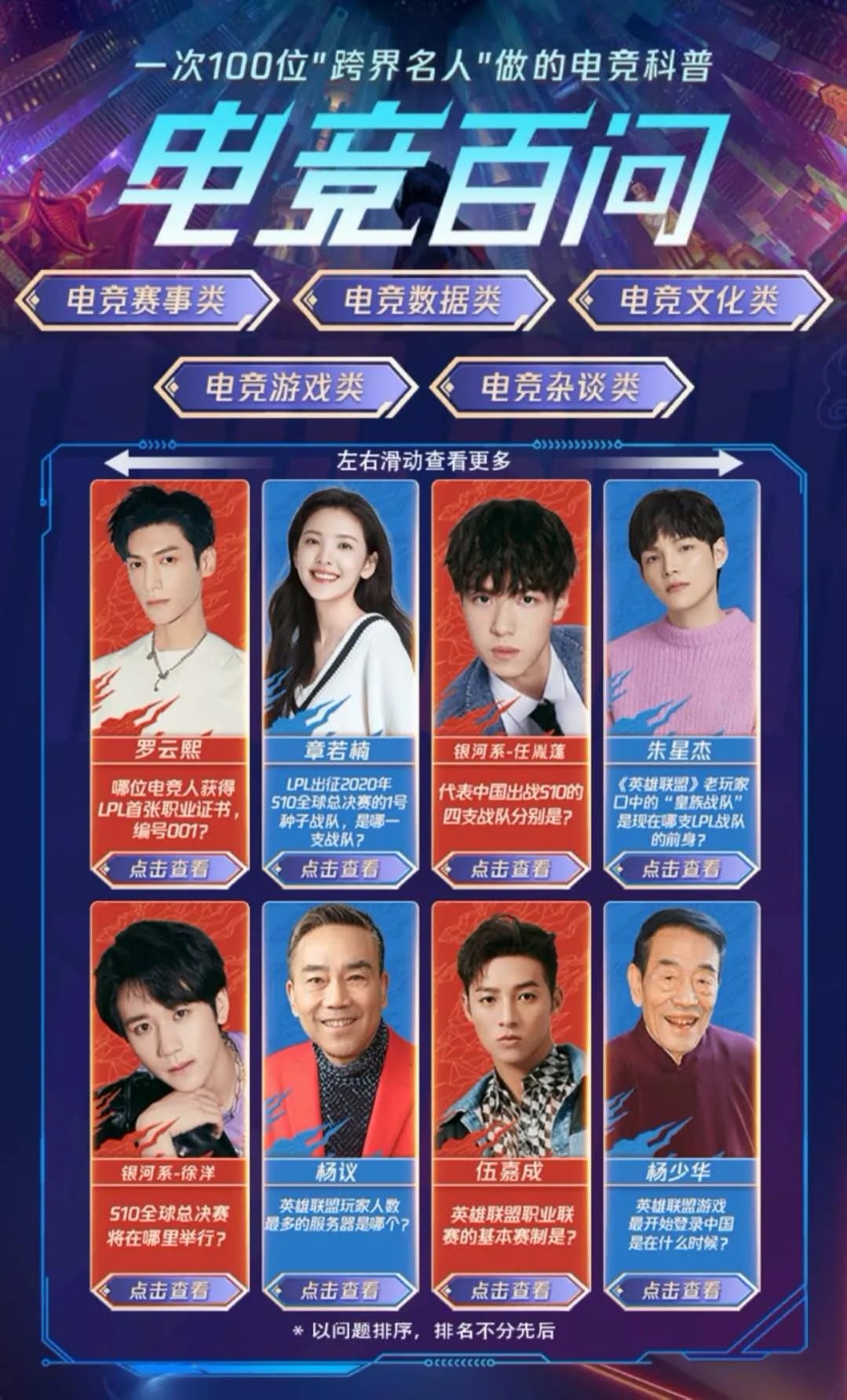 腾讯视频召集了100位“跨界艺人”,发起《电竞百问》活动,借着英雄联盟全球总决赛重回中国的契机,在LPL俱乐部冲击三连冠的进程中,将电竞蕴含的积极向上的、为梦想勇敢拼搏的正能量传递给更多年轻人。