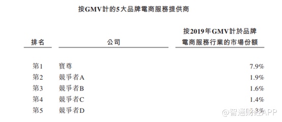 经过多年稳健的运营,宝尊已经奠定了行业龙头的地位。根据2019年GMV计,宝尊电商为国内品牌电商服务提供商行业的龙头,市场占有率排名第一,远远超过第二名1.9%的市场份额,也超过第二名到第五名份额的总和。