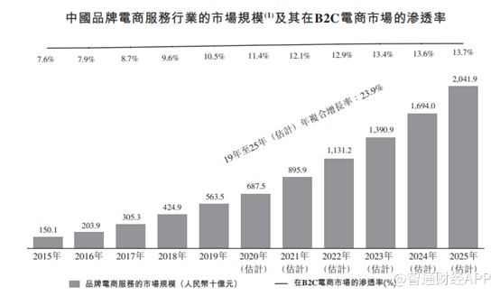 我国的品牌电商服务行业市场空间巨大。智通财经APP了解到,根据艾瑞咨询的数据,2019年中国品牌电商服务市场的规模为5,635亿元,预期于2025年将达到20,419亿元,复合年增长率为23.9%。品牌电商服务的渗透率(即品牌电商服务市场总规模占B2C电商市场总规模的百分比)预期将由2019年的10.5%增至2025年的13.7%。
