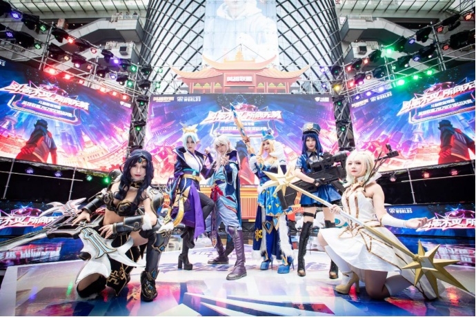 围绕着主舞台的旋转回廊站满了热爱电子竞技的观众,许多粉丝们都在现场的涂鸦墙上留下了自己的记号,和男刀、皮城女警、拉克丝等众多游戏人物COSER留下了合影。