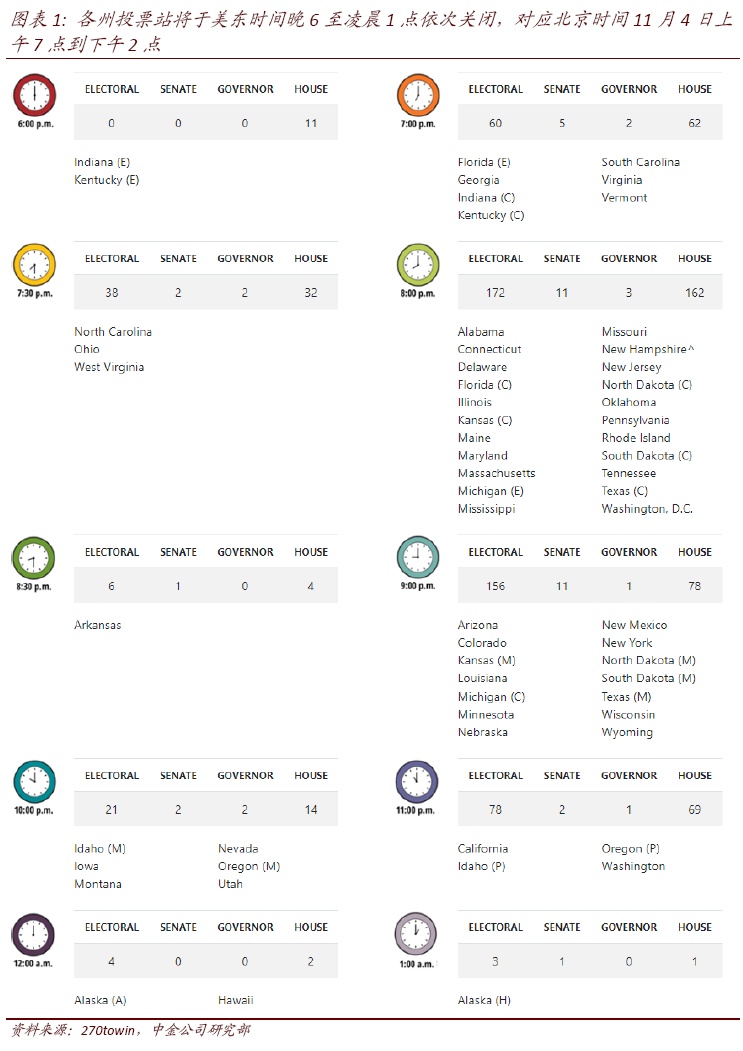 i. 今年投票日的时间安排:11月3日为正式投票日,持续全天,按照时区差异,各州投票站将于美东时间晚6至凌晨1点依次关闭,对应北京时间11月4日上午7点到下午2点(相差13小时)。其中,几个关键州的投票站关闭时间为:佛罗里达(早8点~9点,以下均为北京时间),宾州(早9点)、密歇根和得州(早9点~10点)、威斯康辛(早10点)。