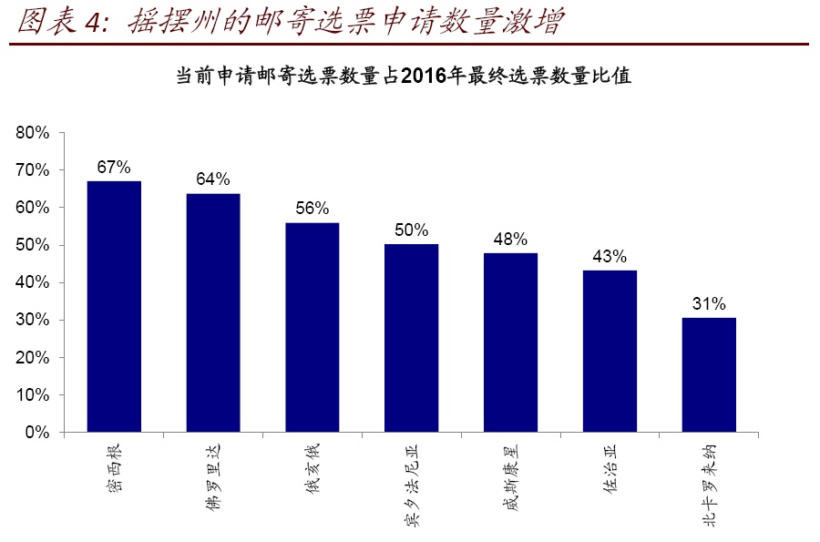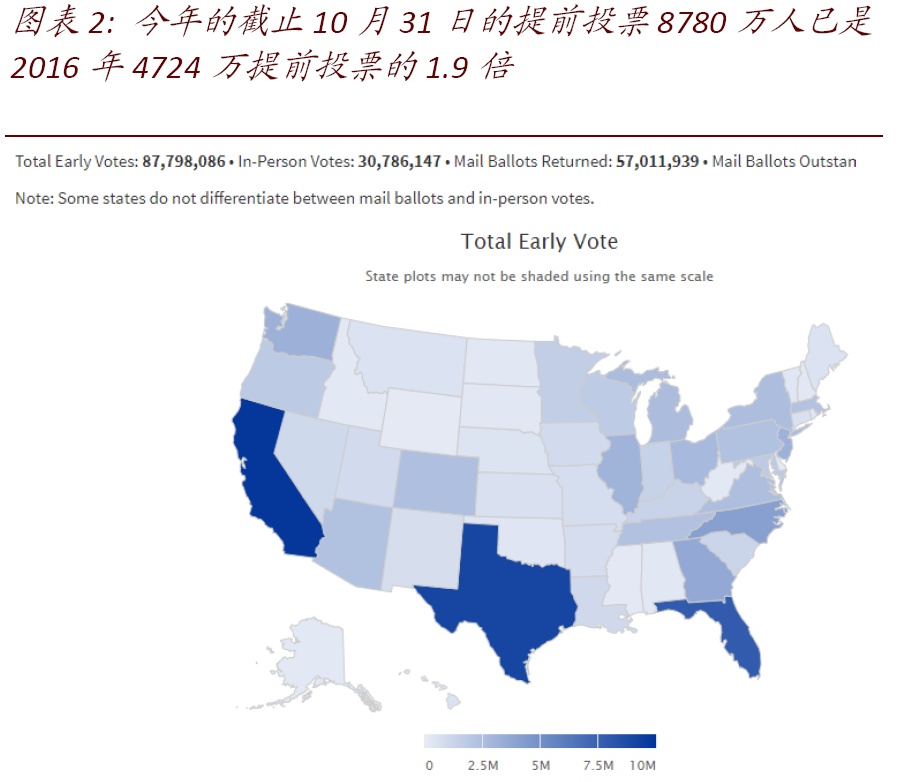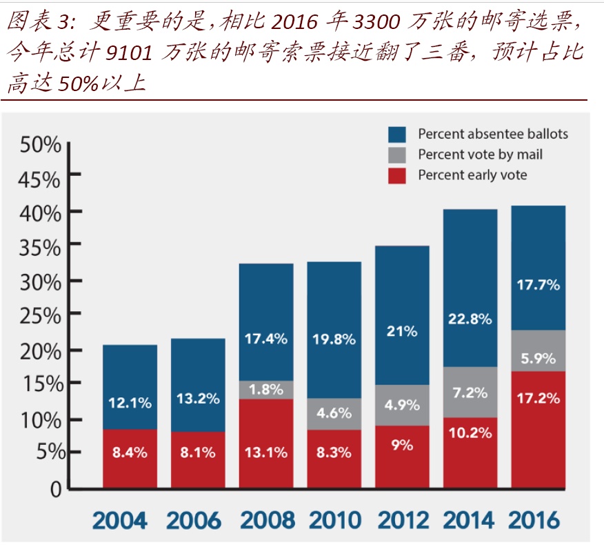iii. 今年的特殊性:邮寄选票翻倍以及不轻易承认败选。受疫情影响,今年提前投票特别是邮寄选票比例激增。2016年总计投票1.37亿(投票率61.4%),其中提前投票34%,邮寄投票~24%。反观今年,提前投票人数激增(截止10月31日为8780万人已是2016年4724万提前投票的1.9倍),尽管会有一定前置效应,但大概率意味着今年投票人数可能较2016年高出3000~4000万。更重要的是,相比2016年3300万张的邮寄选票,今年总计9101万张的邮寄选票接近翻了三番,我们预计占比高达50%以上,其中5701万张已经收到。