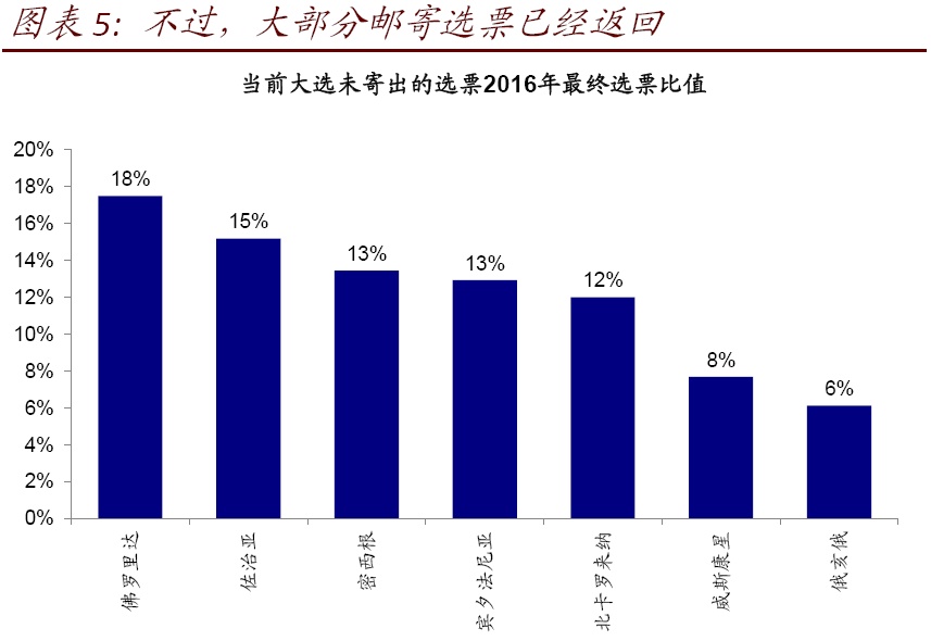 1) 特朗普输掉佛州,意味基本败选,结果大概率在当天成定局。特朗普在普选票上的大幅落后使其可选择的胜选路径较拜登非常有限,失掉佛州将使其胜选路径变得尤为艰难(仅剩6种可能),因此如果丢掉佛罗里达,市场将迅速往拜登胜选方向倾斜。此外,这种情况下也会加快选举结果出炉速度。虽然佛州邮寄选票占比高达64%,但82%的已经返回,而且佛州允许大选日前就开始提前计票,因此将明显加快其最终结果出炉速度,我们预计或在北京时间中午左右。